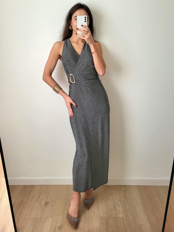Sukienka z odkrytymi plecami , długa , brokatowa w kolorze ciemnego sebra. Niezwykle zmysłowa i elegancka.