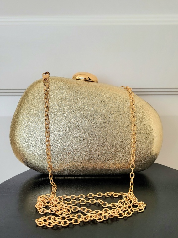 Sztywna torebka kopertówka o nieregularnym kształcie.